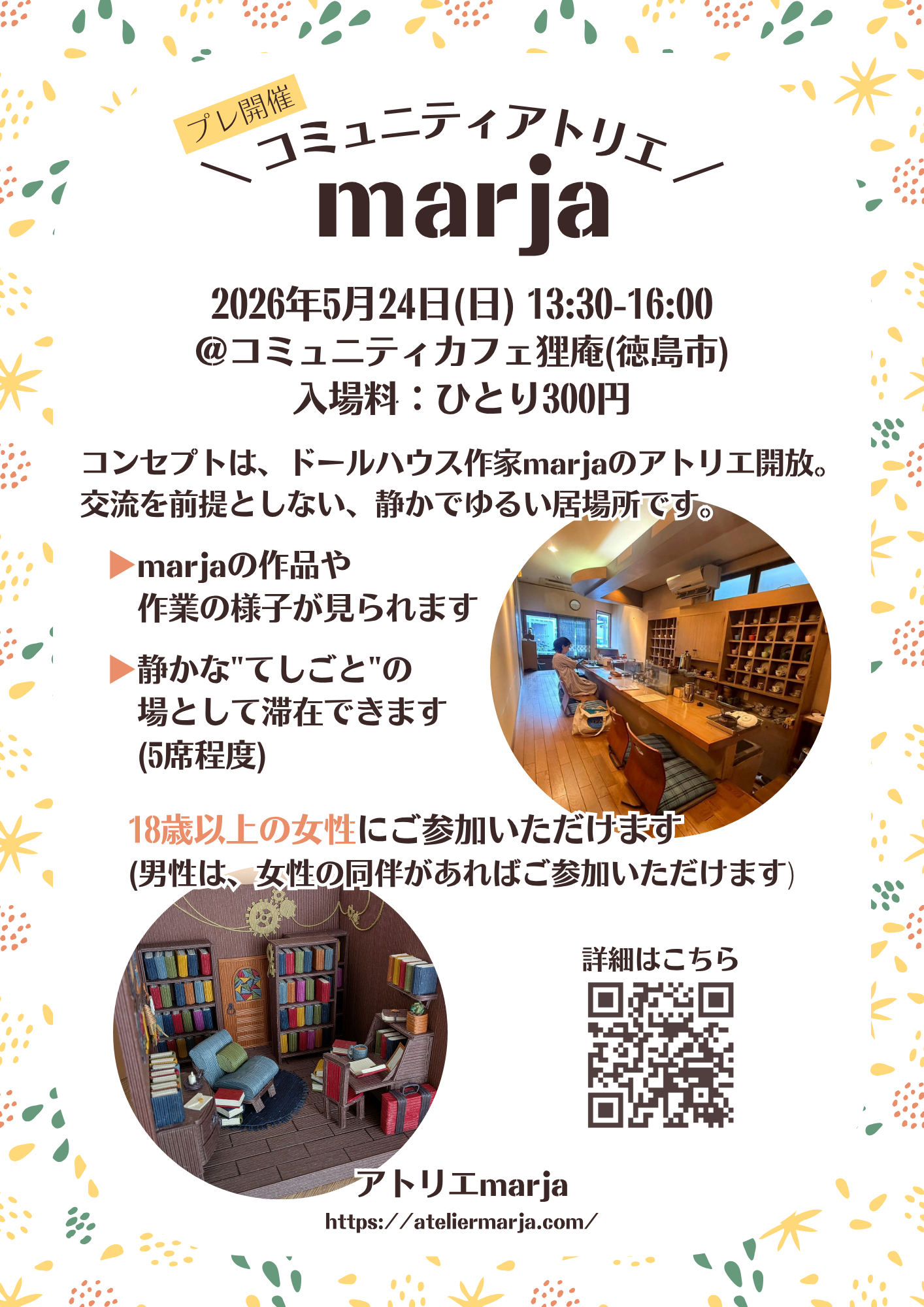 コンセプトは、ドールハウス作家marjaのアトリエ開放。交流を前提としない、静かでゆるい居場所です。
